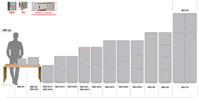 Шкафы представляют собой цельносварную металлическую конструкцию, соединение элементов которой выполнены методом сварки сплошным швом по контуру прилегания элементов. В номенклатурный ряд серии «КБС/КБ» входят шкафы различной высоты и с различным количеством полок и независимых отделений. Глубина шкафа, наличие съемных регулируемых по высоте полок и угол открывания двери подобраны для удобной работы с папками формата А4 или «Корона».