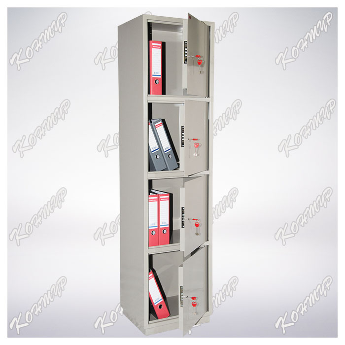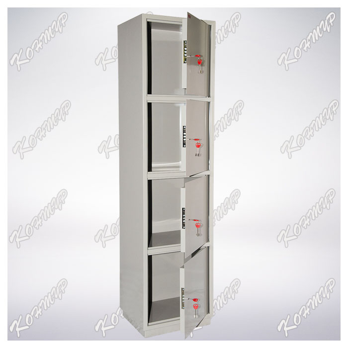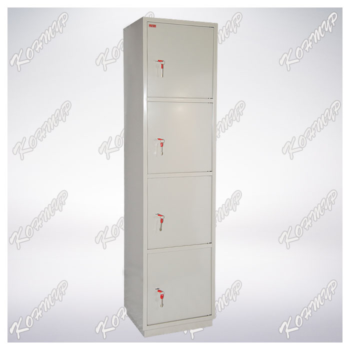 Шкаф представляет собой цельносварную металлическую конструкцию прямоугольной формы, соединение элементов которой выполнены методом сварки сплошным швом по контуру прилегания элементов. Горизонтальные перегородки делят шкаф на 4 независимых отделения, запираемых собственной дверью.