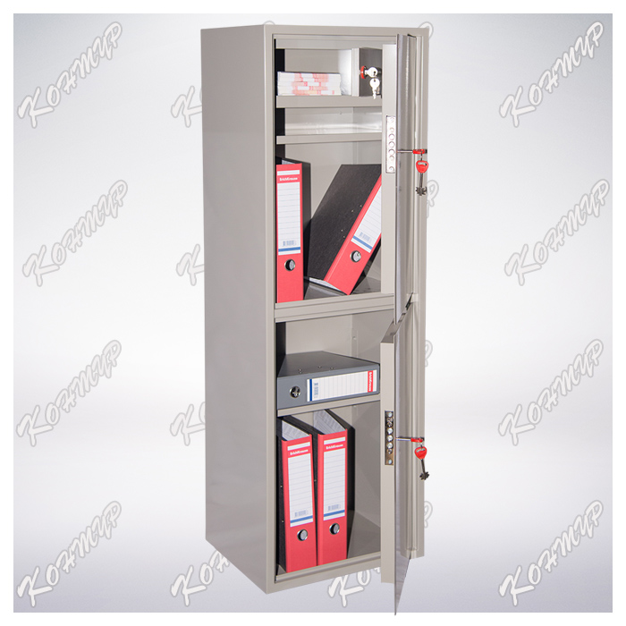 Шкаф представляет собой сварную металлическую конструкцию прямоугольной формы. Горизонтальная перегородка делит шкаф на 2 независимых отделения, запираемых собственной дверью. Корпус и двери шкафа изготовлены из стального листа толщиной 1,2 мм. Двери изнутри усилены панелью коробчатого сечения из стального листа толщиной 0,8 мм. В каждой двери шкафа установлен врезной 6-ти сувальдный замок фирмы «Бордер» (пр-во Россия). В комплекте – 2 ключа (на каждый замок).