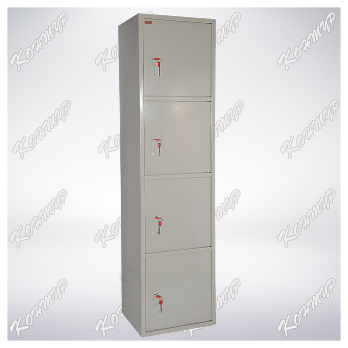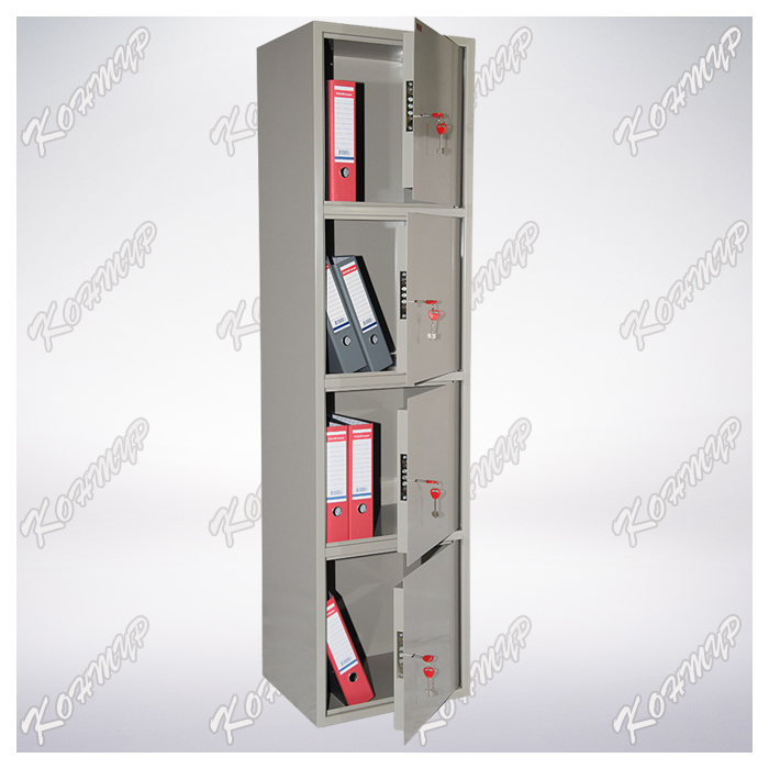 Шкаф представляет собой сварную металлическую конструкцию прямоугольной формы. Горизонтальные перегородки делят шкаф на 4 независимых отделения, запираемых собственной дверью. Корпус и двери шкафа изготовлены из стального листа толщиной 1,2 мм. Двери изнутри усилены панелью коробчатого сечения из стального листа толщиной 0,8 мм. В дверях установлен врезной 6-ти сувальдный замок фирмы «Бордер» (пр-во Россия). В комплекте – 2 ключа. Петли шкафа – внутренние. Окраска — полимерное порошковое покрытие, цвет серый. Гарантийный срок эксплуатации 2 года.
