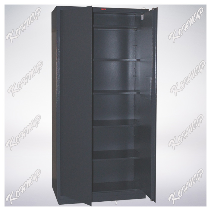 Шкаф двухдверный — левая дверь запирается правой, на которой установлен ключевой сейфовый замок класса «А» с 2-х сторонней ригельной системой запирания вверх/вниз (Ø ригелей 20 мм). Петли двери шкафа – внутренние.