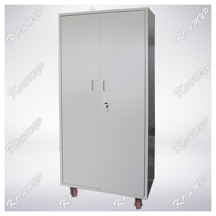 Для безопасного и удобного открывания/закрывания шкафа на обеих дверях предусмотрены ручки, не выступающие за поверхность двери. Кромки дверей скруглены гибом. На внутренней стороне каждой двери имеется рамка под формат листа А4. Правая дверь шкафа оборудована ключевым 8-ми сувальдным замком производства «САМ» (Россия). Левая дверь шкафа оборудована двухсторонней ригельной системой запирания (верх/низ) с расположенным в торцевой части коробки двери приводом ригелей. Конструкция шкафа позволяет фиксировать двери в положении «открыто» на 90о. Петли – внутренние.
