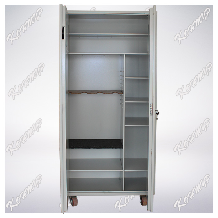 В левом отделении располагается: съемная полка (на расстоянии 250 мм от низа шкафа); съемная полка с фиксатором приклада, покрытая специальным материалом (ковролином), предохраняющим оружие от повреждения о металлические части шкафа при многократных циклах установки/снятия (на расстоянии 500 мм от низа шкафа); съемный регулируемый держатель стволов с шагом перестановки 50 мм. В правом отделении располагаются 5 съемных полок для хранения ЗиП оружия и снаряжения.