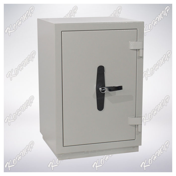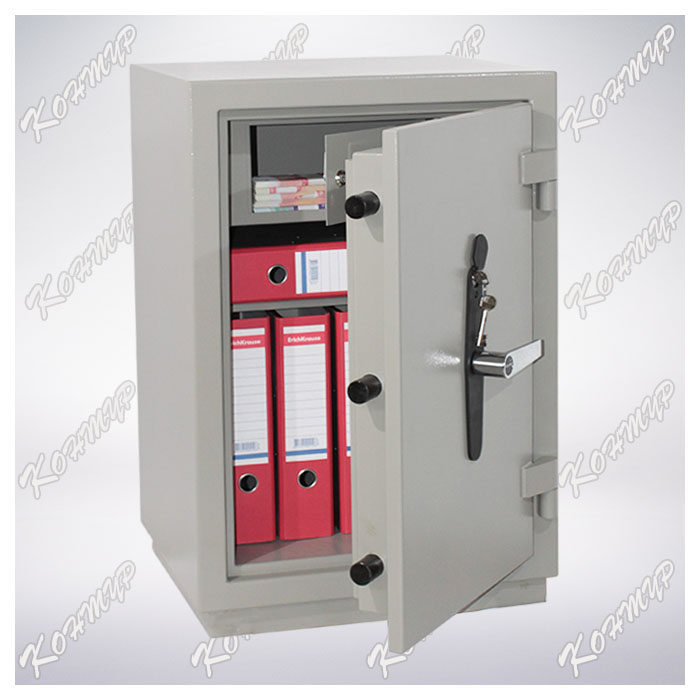 Внутри сейфа располагается отсек ограниченного доступа (трейзер), запираемый на замок «почтового» типа и одна полка. В дне сейфа предусмотрено отверстие Ø11 мм для возможности анкерного крепления его к полу. Дверь сейфа оборудована запорным механизмомс 2-х сторонней ригельной системой запирания (по 3 ригеля Ø28 мм вправо/влево), который блокируется ключевым сейфовым замком класса «А» фирмы «CAWI» или «MAUER» производства Германии. Запорный механизм приводится в действие при помощи ручки. Чтобы открыть сейф необходимо: вставить ключ в замочную скважину, открыть замок и повернуть ручку на 90°. Закрывать в обратном порядке. Петли сейфа наружные, открывание двери – на 180°.