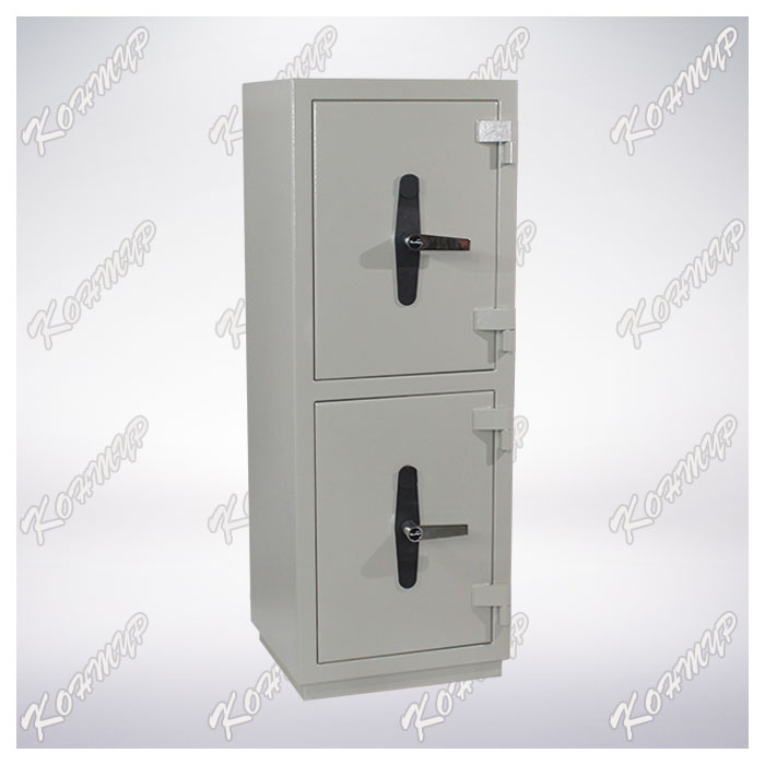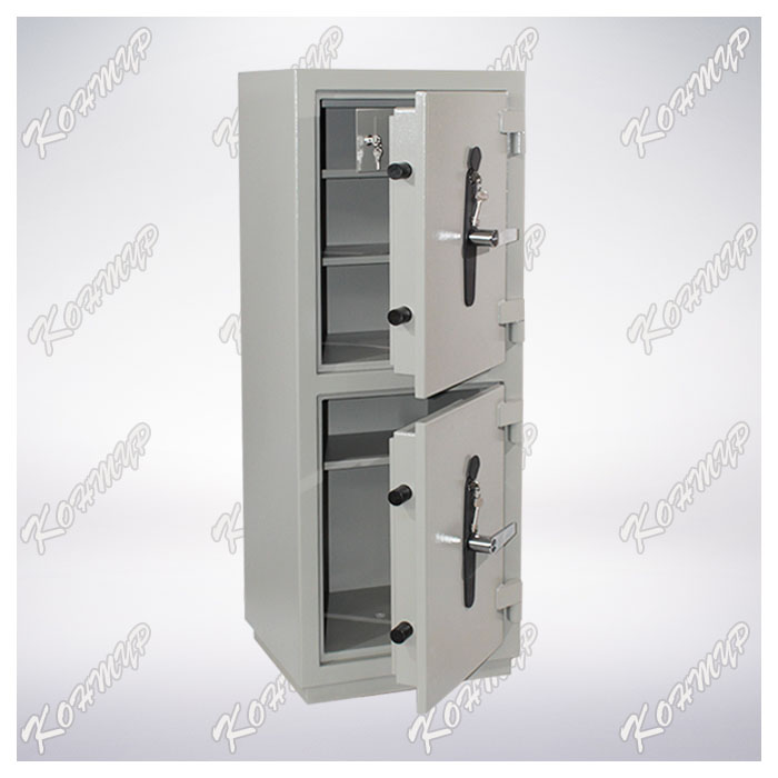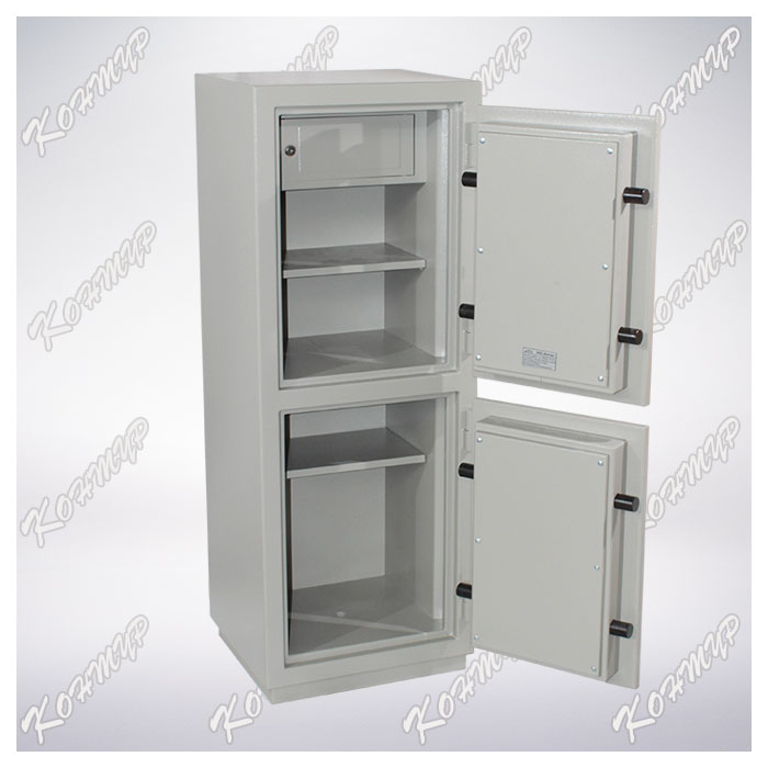 Сейф «КЗ 223т» имеет 2 независимых отделения, запираемых собственной дверью. В верхнем отделении располагается отсек ограниченного доступа (трейзер), запираемый на замок «почтового» типа и одна съемная полка, в нижнем – одна съемная полка.В дне сейфа предусмотрено отверстие Ø11 мм для возможности анкерного крепления его к полу.Каждая дверь сейфа оборудована запорным механизмомс 2-х сторонней ригельной системой запирания (по 2 ригеля Ø28 мм вправо/влево), который блокируется ключевым сейфовым замком класса «А» фирмы «CAWI» или «MAUER» производства Германии. Запорный механизм приводится в действие при помощи ручки. Чтобы открыть сейф необходимо: вставить ключ в замочную скважину, открыть замок и повернуть ручку на 90°. Закрывать в обратном порядке. Петли сейфа наружные, открывание двери – на 180°.