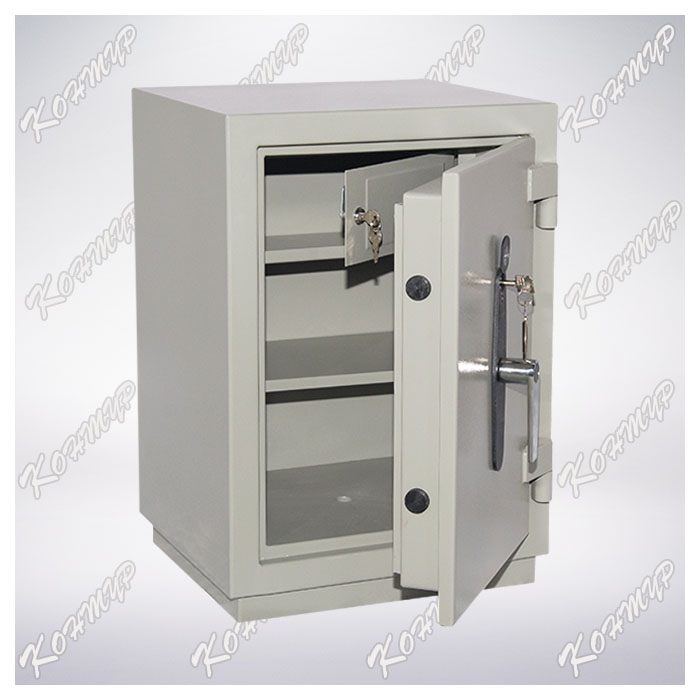Внутри сейфа располагается отсек ограниченного доступа (трейзер), запираемый на замок «почтового» типа и одна съемная полка. В дне сейфа предусмотрено отверстие Ø11 мм для возможности анкерного крепления его к полу. Дверь сейфа оборудована запорным механизмомс 2-х сторонней ригельной системой запирания (по 2 ригеля Ø28 мм вправо/влево), который блокируется ключевым сейфовым замком класса «А» фирмы «CAWI» или «MAUER» производства Германии. Запорный механизм приводится в действие при помощи ручки. Чтобы открыть сейф необходимо: вставить ключ в замочную скважину, открыть замок и повернуть ручку на 90°. Закрывать в обратном порядке. Петли сейфа наружные, открывание двери – на 180°.