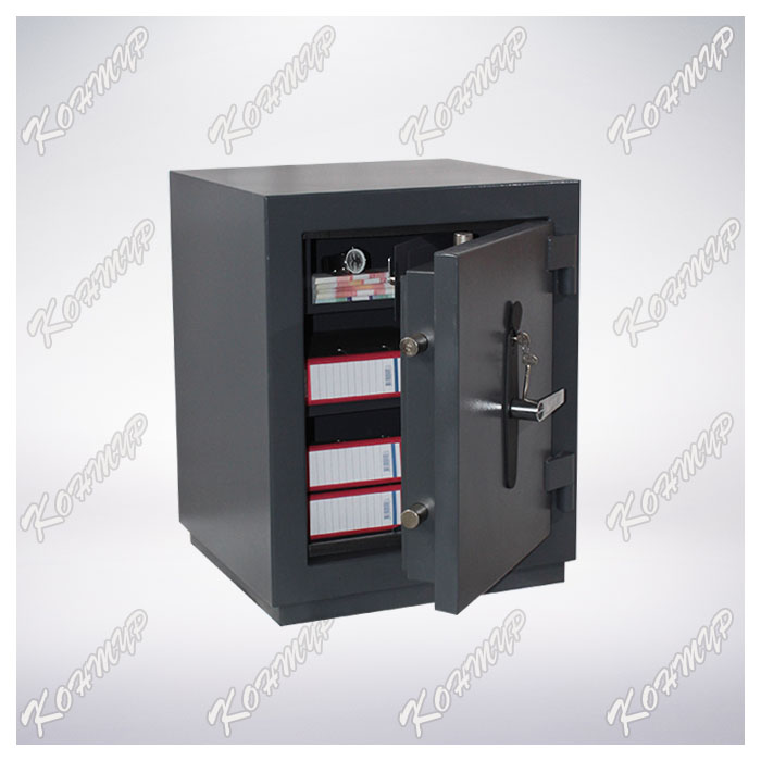 специальным наполнителем, противостоящим распространению огня и повышенной температуры внутрь сейфа. Система запирания двери имеет 3 активных и один пассивный ригель со стороны петель. Сейф оборудован высококачественным запорным механизмом, который блокируется замком сувальдного типа (производство Германия), что обеспечивает необходимую для первого класса надежность от взлома. Внутри сейфа имеется отсек ограниченного доступа — трейзер (внутренний ящик с замком почтового типа) и 1 полка. Предусмотрена возможность анкерного крепления к полу. Окраска полимерное покрытие.