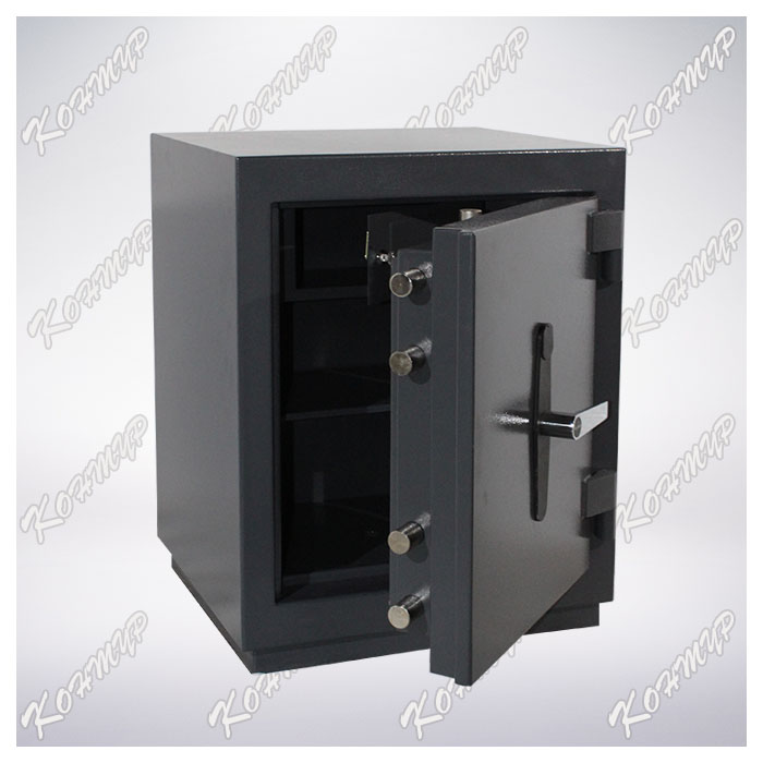 специальным наполнителем, противостоящим распространению огня и повышенной температуры внутрь сейфа. Система запирания двери имеет 6 активных и один пассивный ригель со стороны петель. Сейф оборудован высококачественным запорным механизмом, который блокируется замком сувальдного типа (производство Германия), что обеспечивает необходимую для первого класса надежность от взлома. Внутри сейфа имеется отсек ограниченного доступа — трейзер (внутренний ящик с замком почтового типа) и 1 полка. Предусмотрена возможность анкерного крепления к полу. Окраска полимерное покрытие.