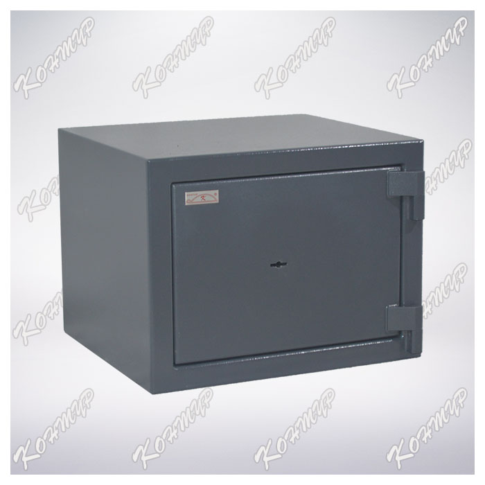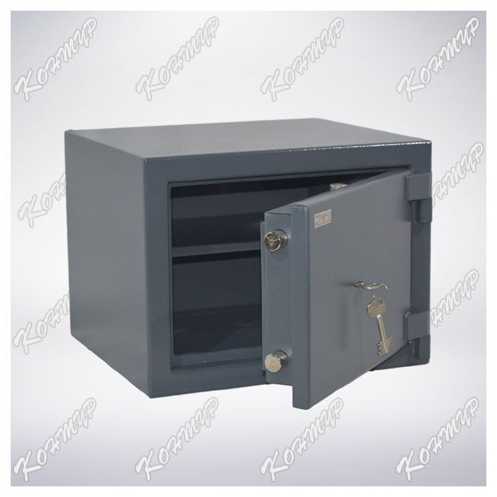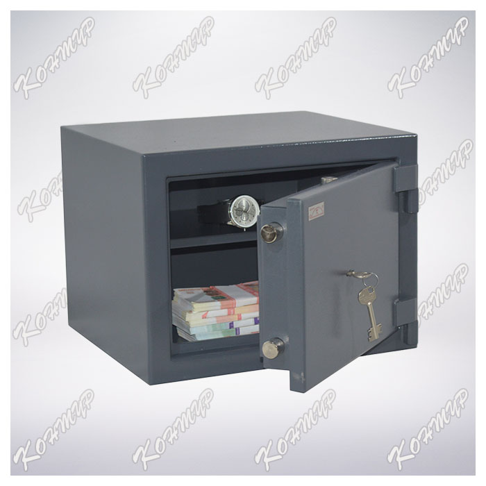 Внутри сейфа располагается 1 съемная полка. В задней стенке сейфа предусмотрено отверстие Ø11 мм для возможности анкерного крепления его к стене. Запирание сейфа осуществляется за счет сейфового замка с 3-х сторонней ригельной системой (2 ригеля Ø24 мм в сторону/1 вверх/1 вниз), а для дополнительной защиты — со стороны петель установлен пассивный П-образный ригель. Петли сейфа наружные, открывание двери – на 180 °