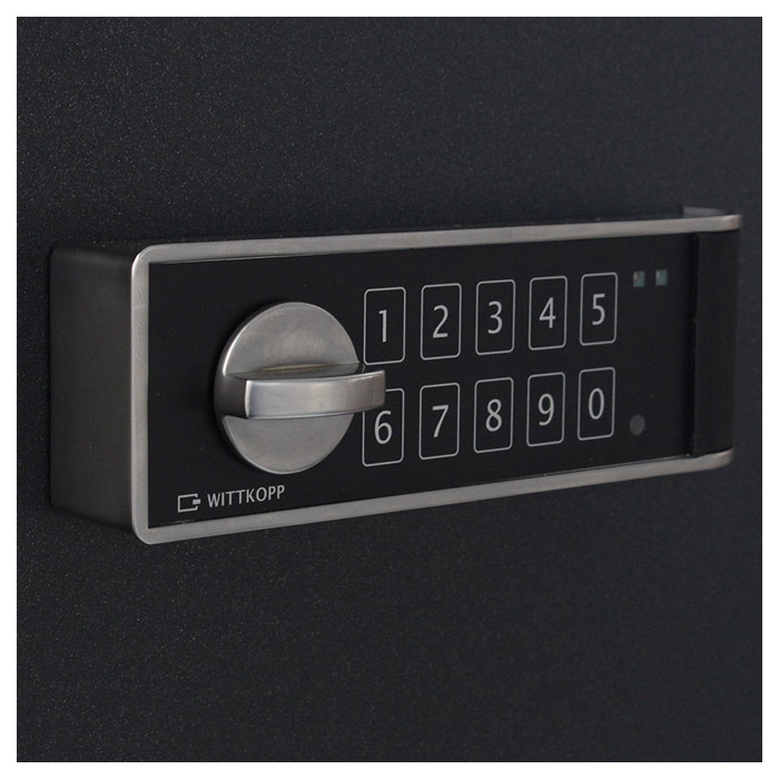 На моделях с литерой «Е» запирание двери производится электронным кодовым замок WITTKOPP ( Производства Германия), оснащённый ригельной системой запирания.